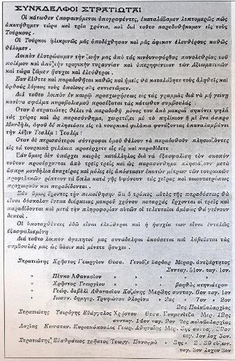 askerlerinin imzaları bulunuyordu. Yunanca atılan bildirinin Türkçe